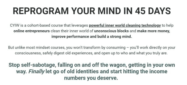 CYIW is for online entrepreneurs who’ve hit an income ceiling and have gone 90+ days without cleaning their inner world. If this is you, then you probably: